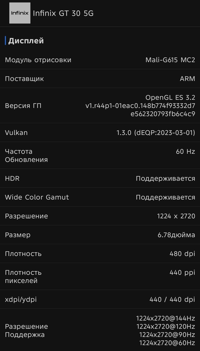 GT 30 оснащен AMOLED-матрицей с диагональю 6,78 дюйма и разрешением 1,5K (1224 × 2720 точек, плотность 440 ppi). Он поддерживает динамическую частоту обновления до 144 Гц, но это не LTPO-панель, поэтому изменение происходит с большим шагом между 60, 90 и 120 Гц, а режим 144 Гц доступен только в определенных приложениях. Сенсорный слой поддерживает частоту опроса до 240 Гц и прекрасно регистрирует до десяти одновременных касаний, моментально обрабатывая все свайпы и жесты.