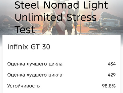 - Steel Nomad Light Stress Test Unlimited – 434 (лучшая), 429 (худшая)