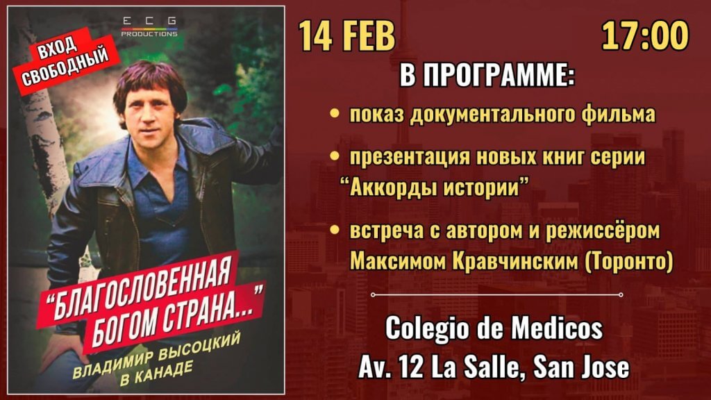 Совсем скоро, 14 февраля 2026 года, у нас в Коста-РикеМаксим Кравчинский со своим документальным фильмом «Благословенная Богом страна» о пребывании Владимира Высоцкого в Канаде и презентацией новых книг из серии «Аккорды истории»!