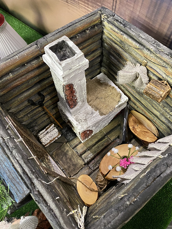 — У союза мастеров «Иные грани», которым руководит Наталия, много проектов, — рассказывает Светлана Калашник. — Так появились мои куклы во вселенную Гарри Поттера, для проекта «Сказки» — избушка на курьих ножках с Бабой-ягой, для проекта «Деревня» — композиция «Федорино горе» по мотивам стихотворения Корнея Чуковского. Федора — деревенский житель. Отсюда коза и куры, коты и десятки предметов посуды. Конечно, кое-что додумывала в процессе создания — берёзу, например, или поленницу дров, сделанных из бутылочных пробок. Но так увлекательно представлять, как зажжется лампа в избе, а там повсюду паутина и её хозяева, наблюдать, как от движения посетителей мимо экспозиции колышется бельё на верёвке.