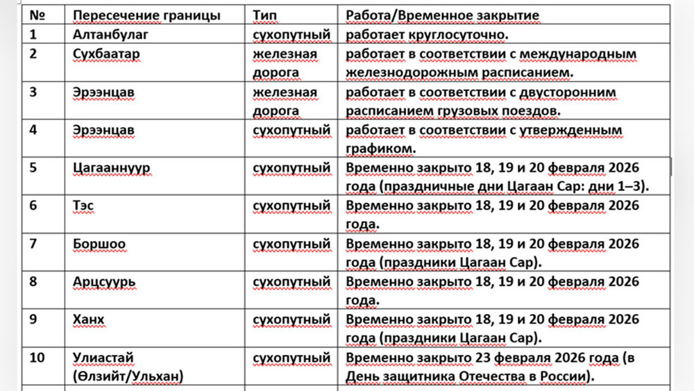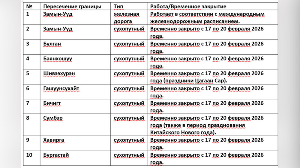 В связи с 17 по 20 февраля 2026 года Монголия временно закроет свои автомобильные пограничные переходы с Китаем и Россией в связи с празднованием традиционного монгольского Нового года (Цагаан Сар).