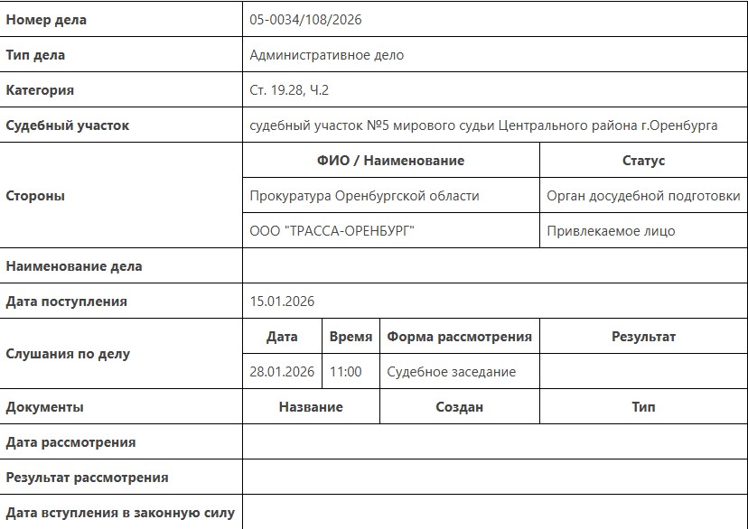 В производство суда поступило постановление о возбуждении административного дела по статье «Незаконное вознаграждение от имени юридического лица, совершенное в крупном размере» в отношении ООО «Трасса-Оренбург».
