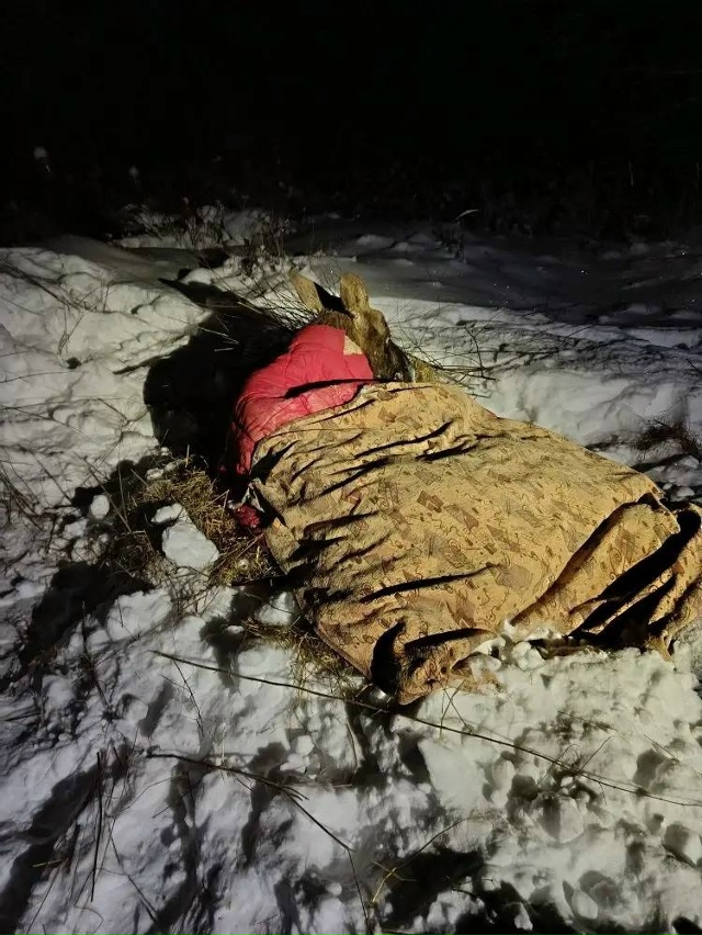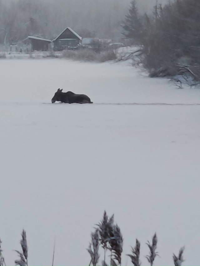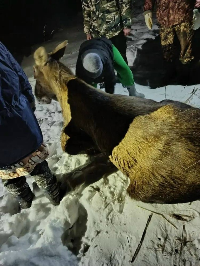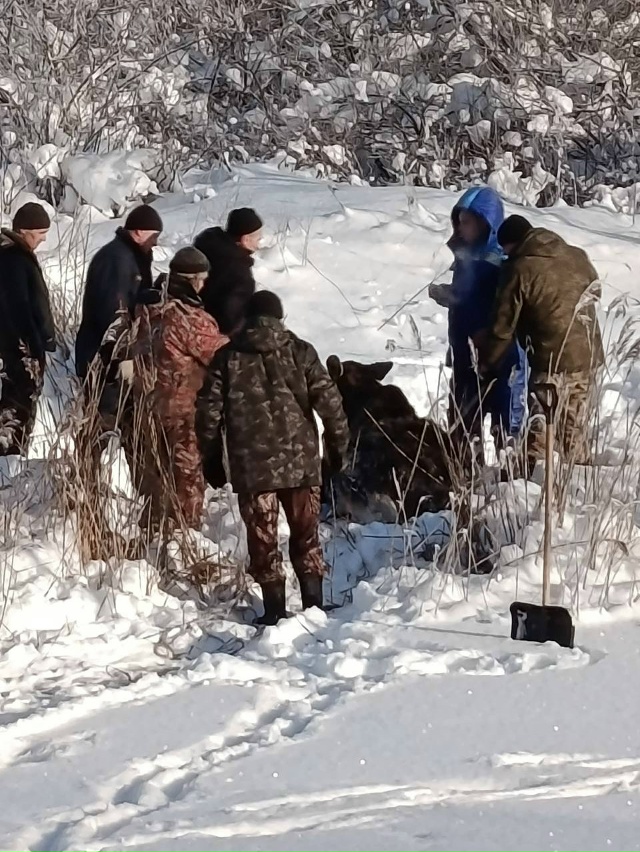 Бедолага провалился под лед, его достали общими усилиями, но встать лось не может