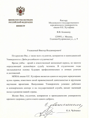 В адрес Университета имени О.Е. Кутафина (МГЮА) поступило поздравление с Днем российского студенчества от Министра юстиции Российской Федерации, председателя Наблюдательного совета Университета имени О.Е. Кутафина (МГЮА) Константина Чуйченко.