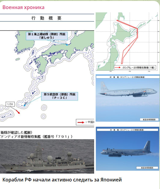Ранее также сообщалось, что 23 числа российский самолёт Ил-20 пролетел над Японским морем к побережью префектуры Киото, а 26 числа вышел в район Тохоку со стороны Тихого океана. С учётом характеристик этих кораблей и самолётов в Токио считают, что речь идёт о разведывательной деятельности и сборе информации: