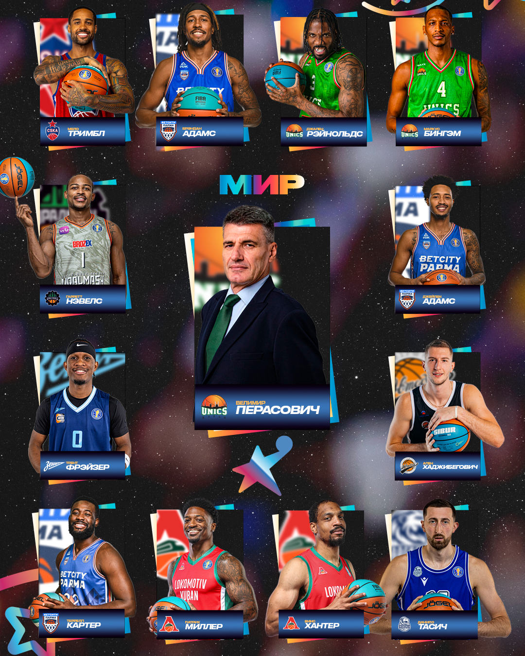 «Звезды Мира»: Патрик Миллер («Локомотив-Кубань»), Джейлен Адамс («БЕТСИТИ-ПАРМА»), Ален Хаджибегович («Автодор»), Террелл Картер («БЕТСИТИ-ПАРМА»), Мело Тримбл (ЦСКА), Брэндан Адамс («БЕТСИТИ-ПАРМА»), Маркус Бингэм (УНИКС), Джален Рэйнольдс (УНИКС), Данило Тасич («Енисей»), Винс Хантер («Локомотив-Кубань»), Гарретт Нэвелс («Уралмаш»), Трент Фрэйзер («Зенит»)
