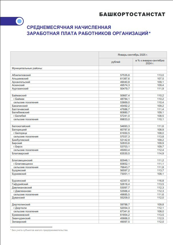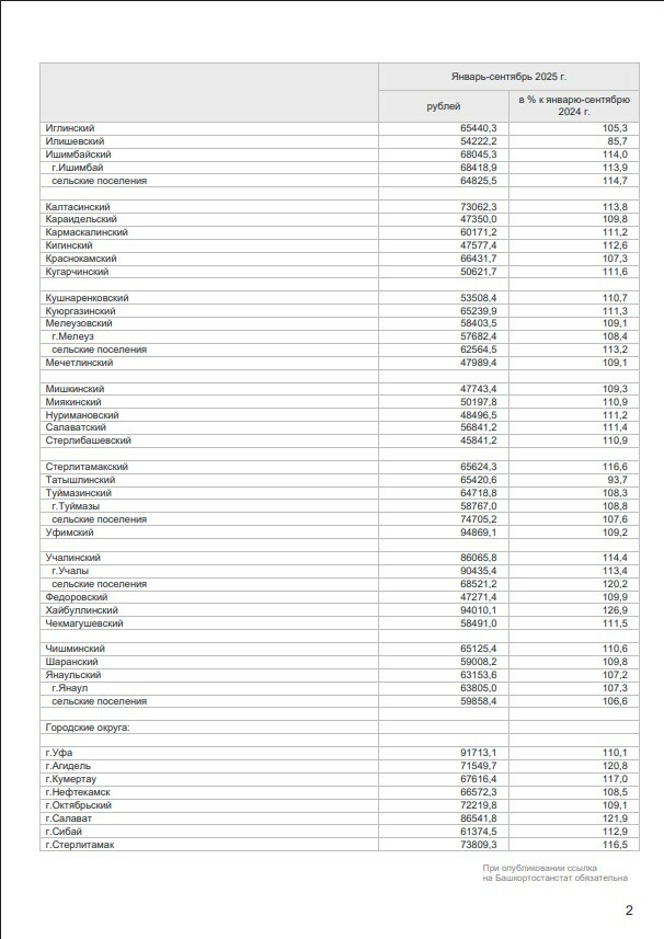 Башстат опубликовал данные о среднемесячных зарплатах в городах и районах республики в январе-сентябре 2025 года. Напомним, за этот период средняя зарплата в Башкирии составила 72 153 рубля, увеличившись показателя аналогичного периода 2024 года на 11,1%.