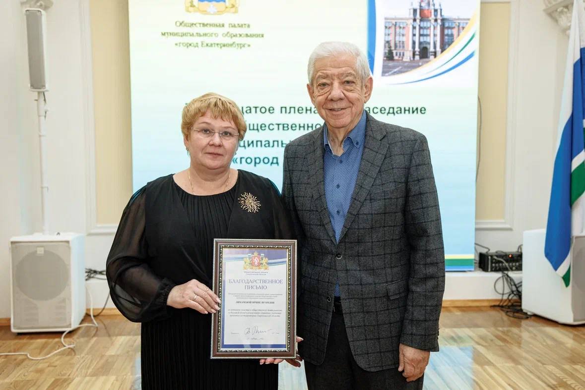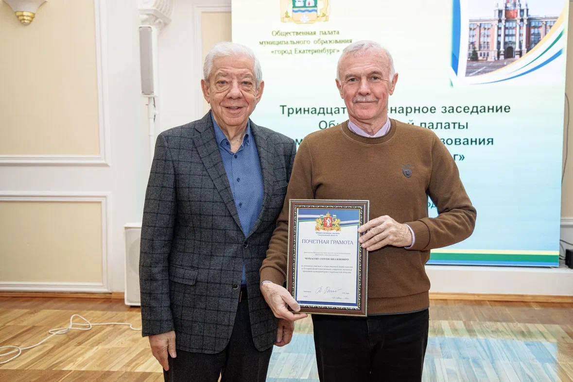 «Общественная палата Свердловской области очень тесно взаимодействует с Общественной палатой города Екатеринбурга. Рад видеть среди её представителей также членов Общественной палаты региона. Это ещё один показатель нашей совместной работы на благо гражданского общества. Сегодня Общественная палата Екатеринбурга подводит итоги своей деятельности, и я хочу отметить, что в 2025 году Общественной палате Свердловской области исполнилось 15 лет. Мы это событие отметили проведением большого Гражданского форума, собравшего всех председателей и членов общественных палат городов и районов, руководителей и членов общественных советов при органах государственной власти. Форум продемонстрировал, что роль общественных палат, общественности и гражданского общества постоянно растёт. Формирование общественных палат в муниципалитетах служит важным звеном связи между народом и органами власти. На сегодняшний день в регионе действует 73 общественные палаты. За прошедшие 15 лет Общественная палата Свердловской области и Общественная палата города Екатеринбурга проделали значительную работу. Поэтому вполне закономерно, что теперь, согласно федеральному закону о выборах глав городов и муниципальных образований, общественная палата имеет право выдвигать кандидатов на должности мэров. Общественная палата Свердловской области уже воспользовалась данным правом и выдвинула кандидатуры на посты глав Екатеринбурга и ряда других городов региона. Таким образом, голос общественности становится всё громче!» — подчеркнул в своём выступлении председатель Общественной палаты Свердловской области Александр Левин. Александр Юрьевич также выразил благодарность членам Общественной палаты города Екатеринбурга за активное участие в общественной деятельности и большой вклад в реализацию социально значимых проектов на территории Свердловской области Почетной грамотой Общественной палаты Свердловской области награжден заместитель председателя Общественной палаты муниципального образования "город Екатеринбург" Сергей Черкасов. Благодарственным письмом - председатель комиссии по развитию социальной сферы, здравоохранению и защите прав нуждающихся граждан Общественной палаты муниципального образования "город Екатеринбург" Ирина Лихачева.