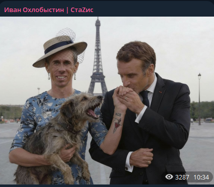 Актёр и кинорежиссёр Иван Охлобыстин опубликовал в телеграм-канале фотошутку: фото четы Макронов на фоне Эйфелевой башни, но с одним нюансом - вместо Брижит на снимке изображен одиозный актёр Алексей Панин* с собачкой. На запястье Панина* - татуировка с буквами "КГБ".