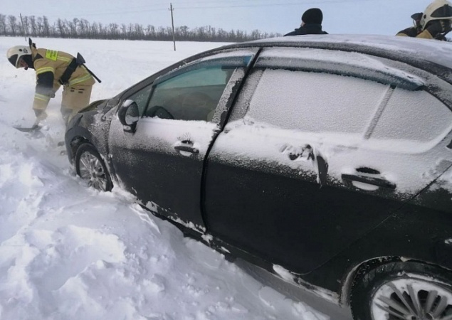 На Кубани пожарные освободили школьный автобус и легковушку, застрявшие в снегу