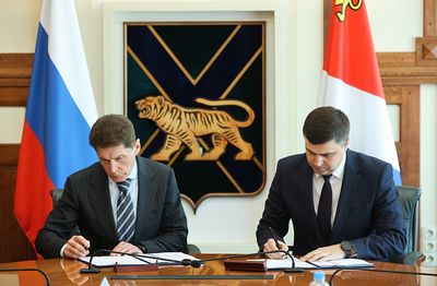 По завершении рабочей встречи Губернатор Приморья Олег Кожемяко и начальник дальневосточного филиала РЖД Евгений Вейде подписали соглашение о взаимодействии и сотрудничестве в области железнодорожного транспорта на 2026 – 2028 годы.
