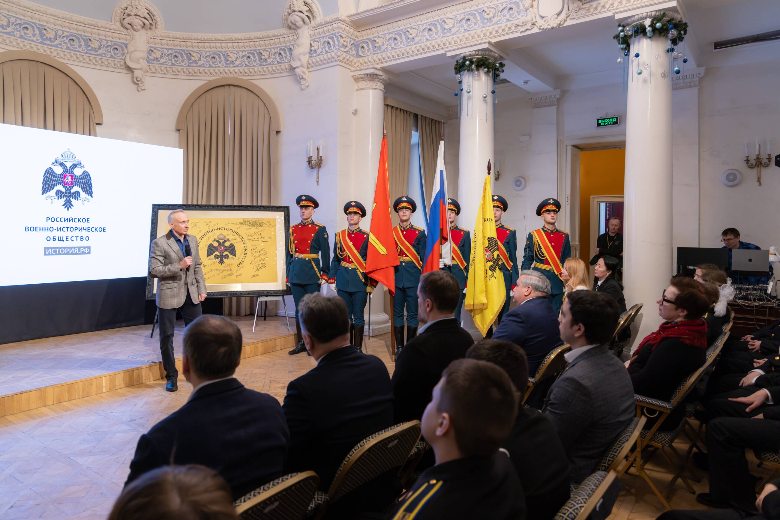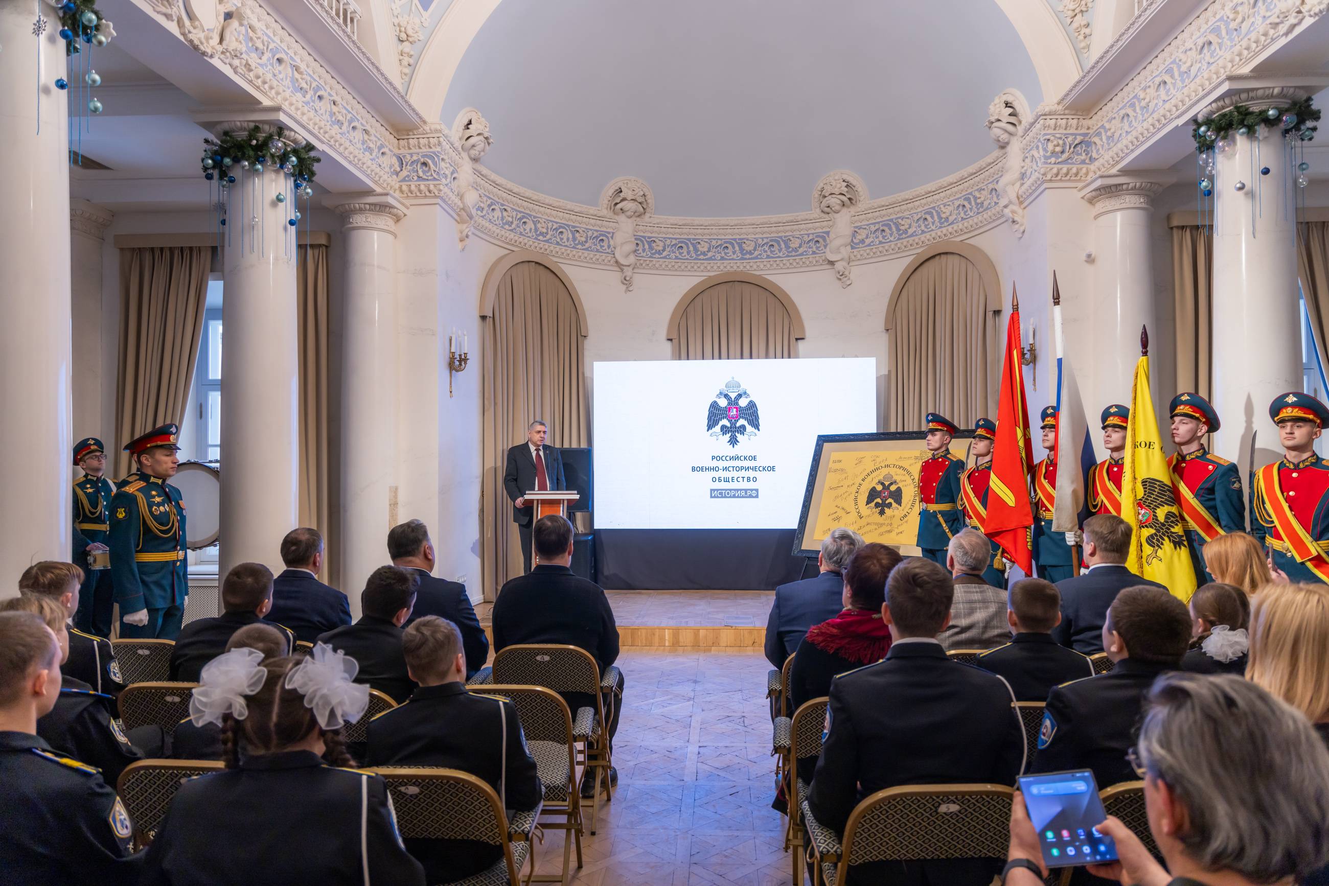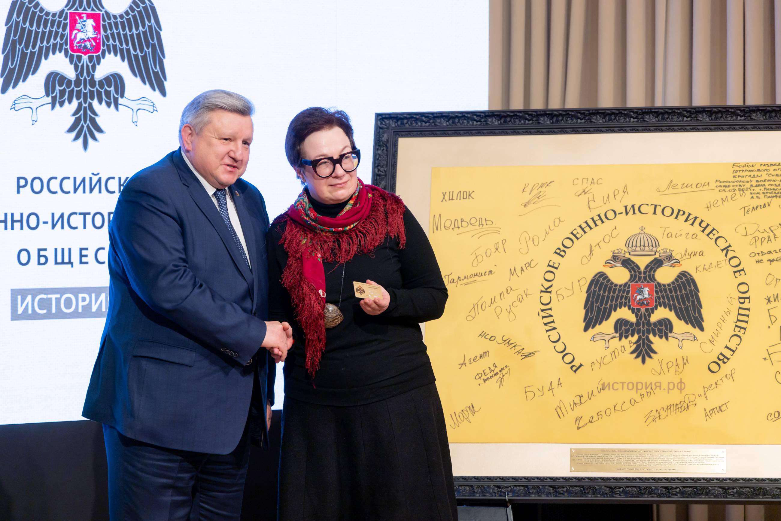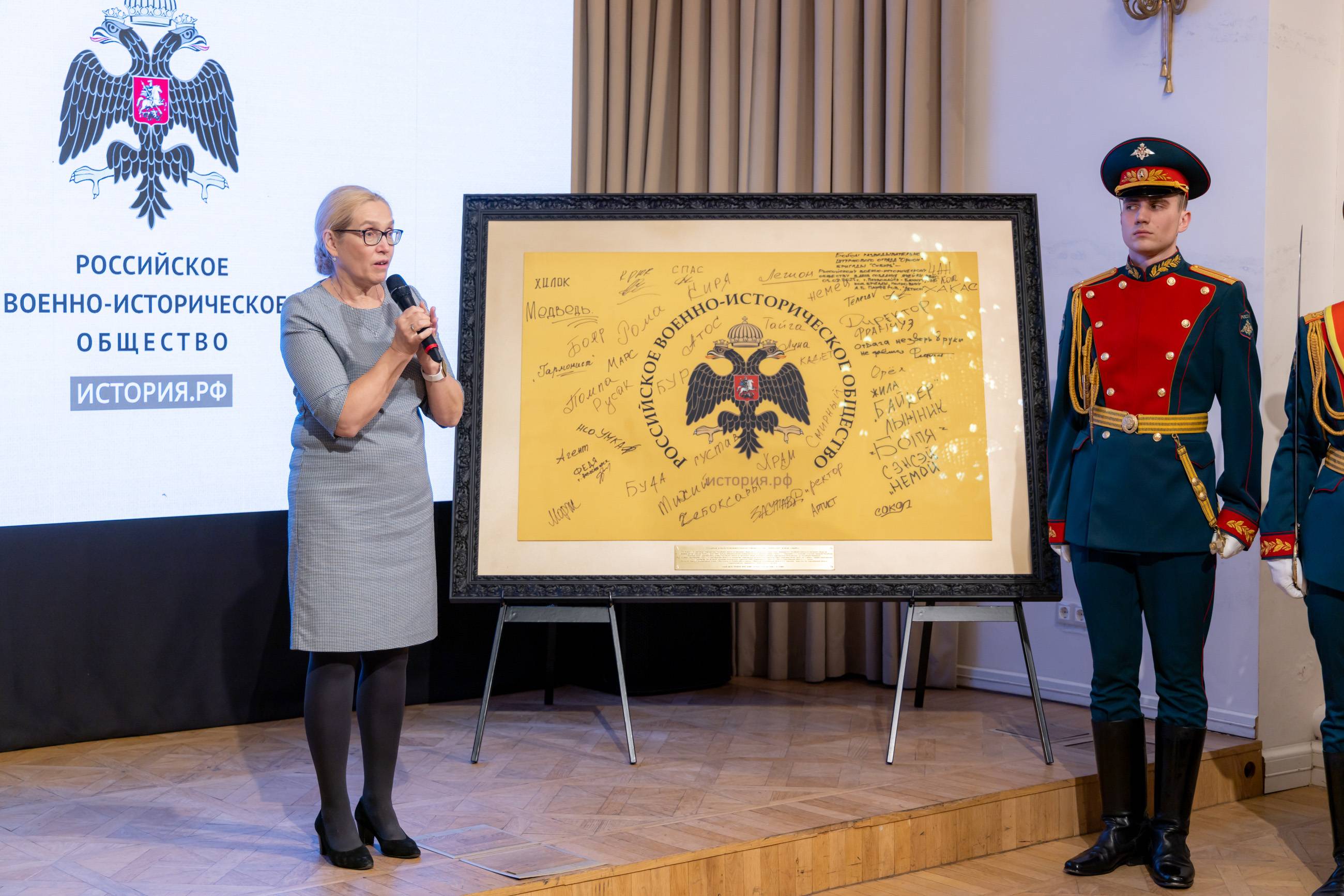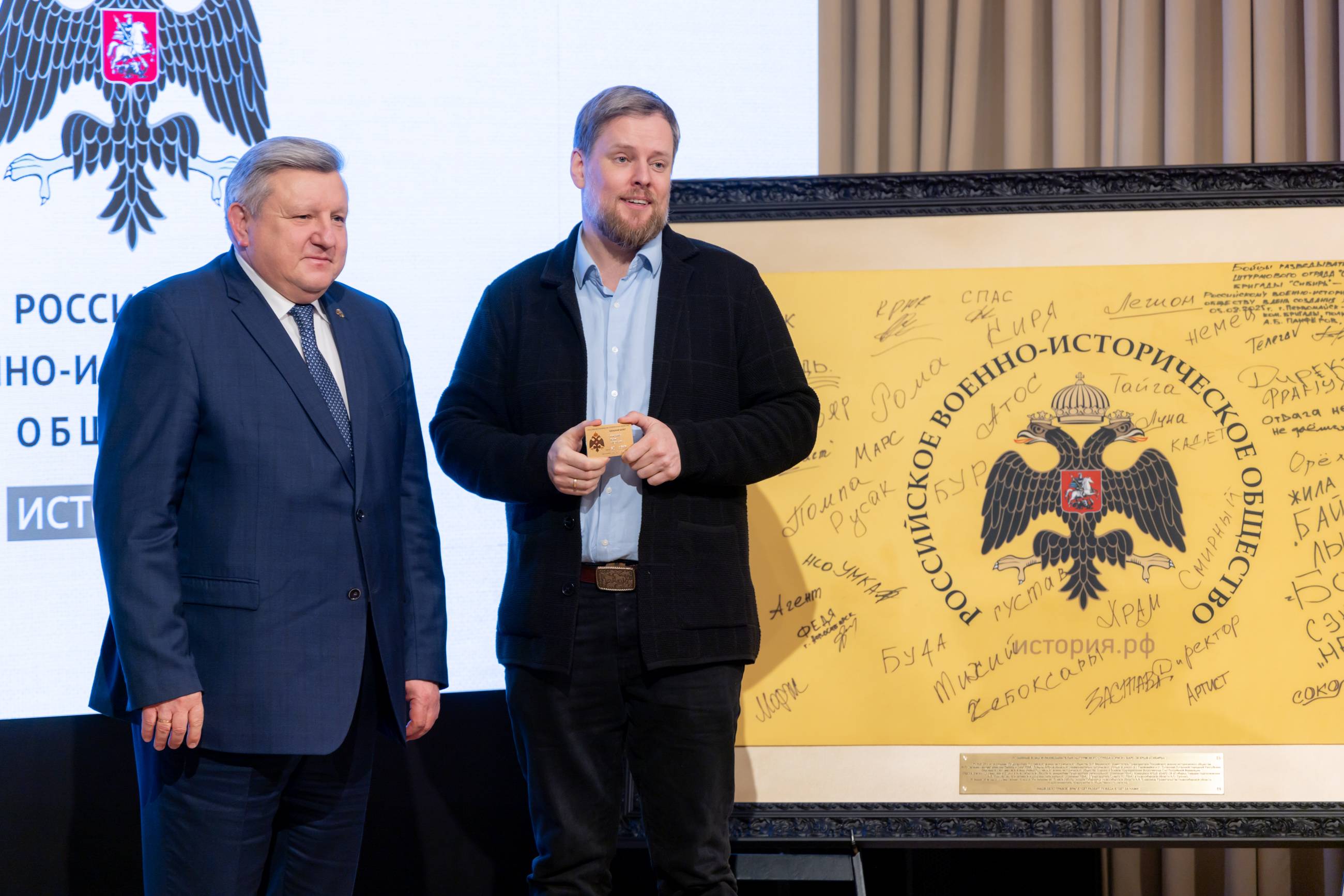 В завершении церемонии состоялось вручение членских билетов Российского военно-исторического общества давним друзьям и соратникам Общества, лидерам общественного мнения - Ивану Кондакову, Марии Большаковой и Михаилу Онуфриенко.