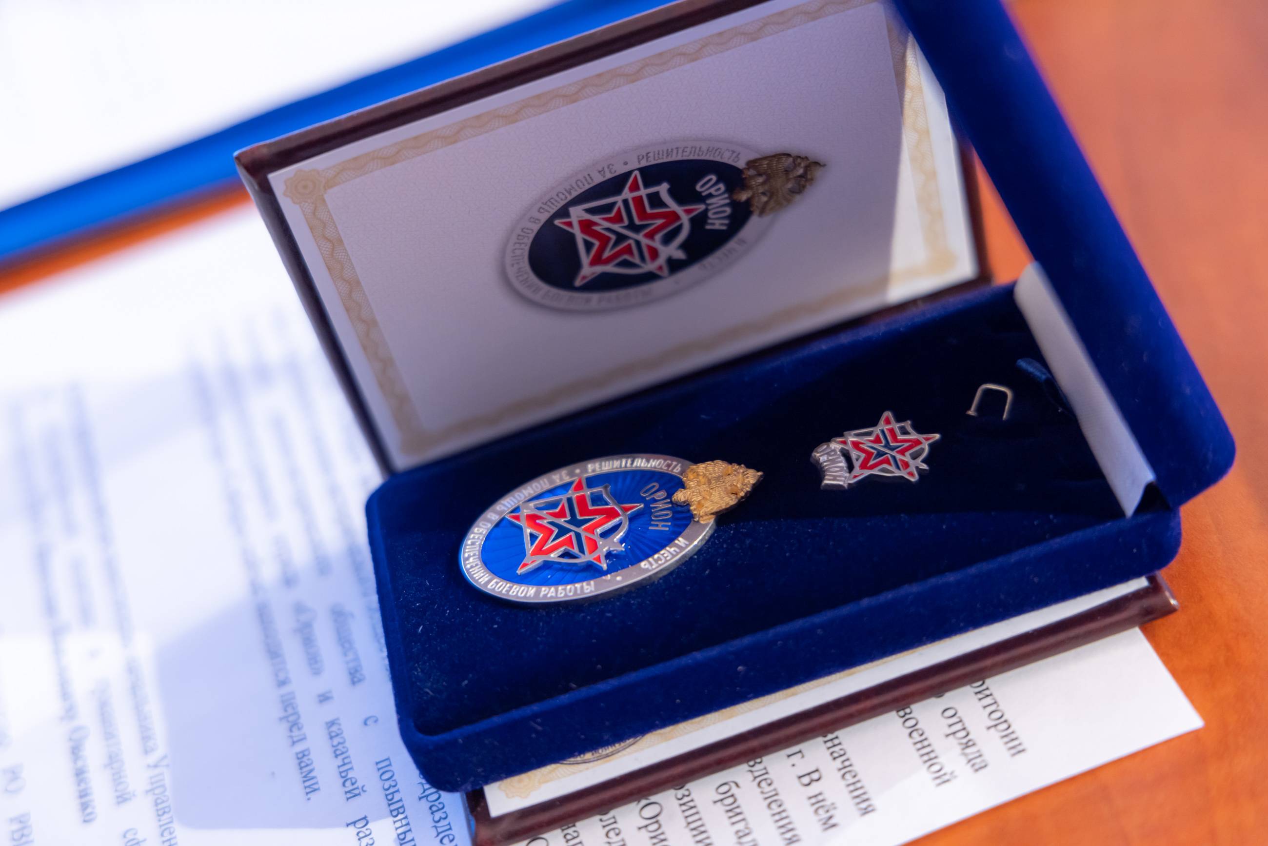 За помощь в боевой работе отряда Андрей Панфёров вручил почетный знак разведывательно-штурмового отряда «Орион» Николаю Овсиенко.
