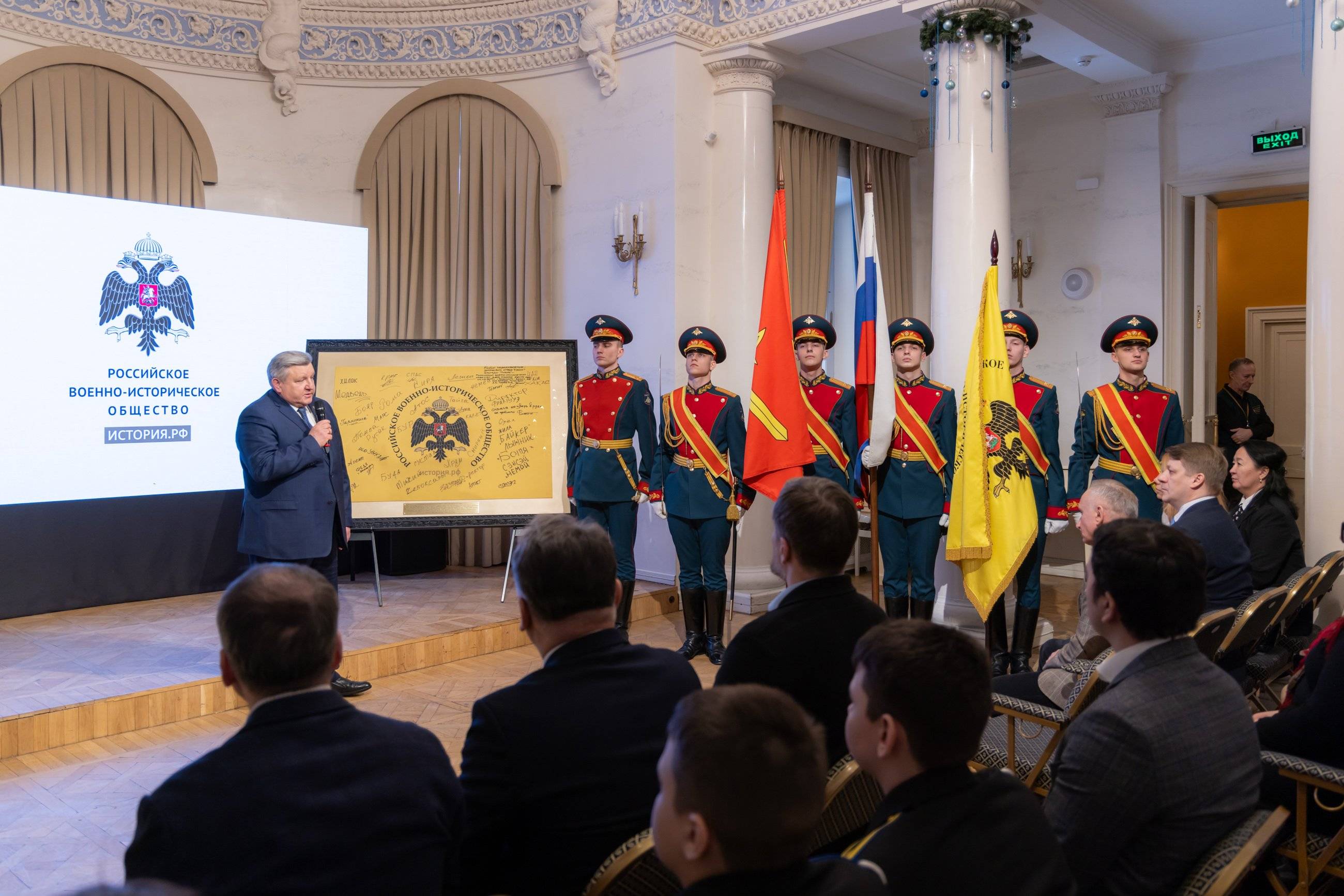 - Сегодня вы видите совершенно удивительный артефакт. Этот флаг с позывными наполнен судьбами. Наши бойцы, получая членские билеты Российского военно-исторического общества, расписывались не в ведомости, а на боевом флаге. Вручая эти билеты, я сказал нашим соратникам – история Русского императорского военно-исторического общества говорит о прекращении деятельности Общества в связи с тем, что сто процентов личного состава Общества ушли на фронты Первой мировой войны. И мы сегодня являемся продолжателями, наследниками того героического генетического кода Победителей, который в нас есть, - сказал Николай Овсиенко. Он поделился воспоминаниями о церемонии вручения билетов в прифронтовой зоне - Трогательно было слушать бойцов. На вопрос – а вам это зачем? Ответ – вот это чувство причастности к сообществу настоящих патриотов Отечества. Удивительно, но это так. Это не громкие слова. Люди, в том числе, шли на смерть и при этом они хотели быть частью нашего сообщества соратников,