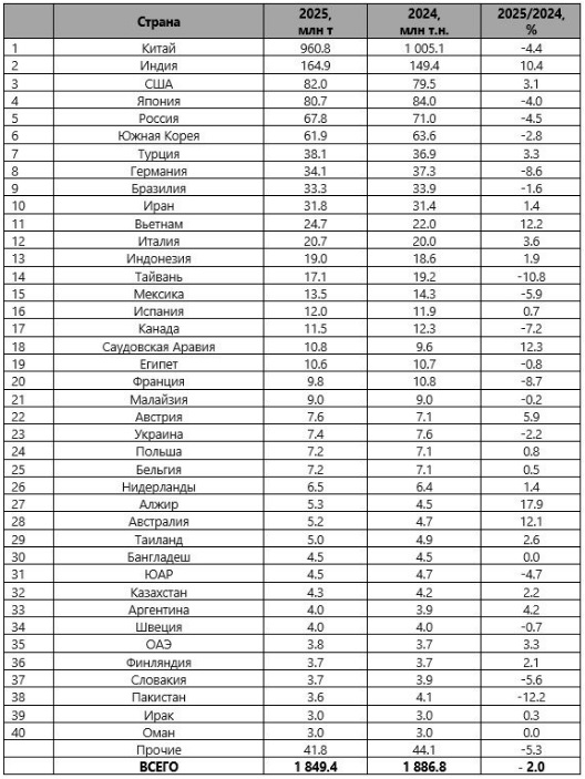 По данным World Steel Association (WSA), в 2025 г. объем производства стали в 70 странах, которые подают свои статистические данные, составил 1 849.4 млн тонн (-2% к 2024 г.) – это минимум с 2020 г.