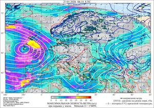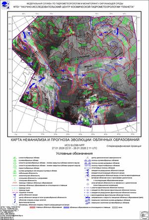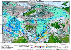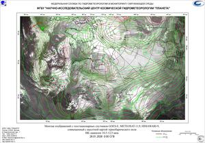 В период с 27 по 28 января на европейской территории России (ЕТР) прослеживалось влияние системы атмосферных фронтов Европейского циклона, которая протянулась с юго-запада через Центральный и Приволжский федеральные округа (ФО) на юг Коми. При этом над Северо-Западным ФО отмечалось усиление Арктического антициклона. Облачные системы атмосферных фронтов, связанные с циклоном, отчетливо прослеживаются на карте нефанализа и монтаже спутниковых изображений, совмещенном с картой термобарического поля.