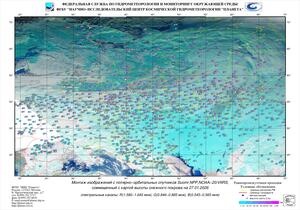 На монтаже спутниковых изображений, совмещенном с приземной картой термобарического поля, прослеживается распределение температуры воздуха на ЕТР. На всей территории России наблюдается отрицательный фон температуры.