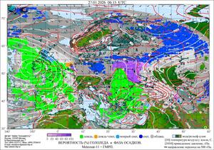 По спутниковым данным 27 января на большей части ЕТР диагностированы небольшие и умеренные осадки преимущественно в виде снега, на юго-западе – высокая вероятность гололеда. На юге усиление ветра до 15 м/с