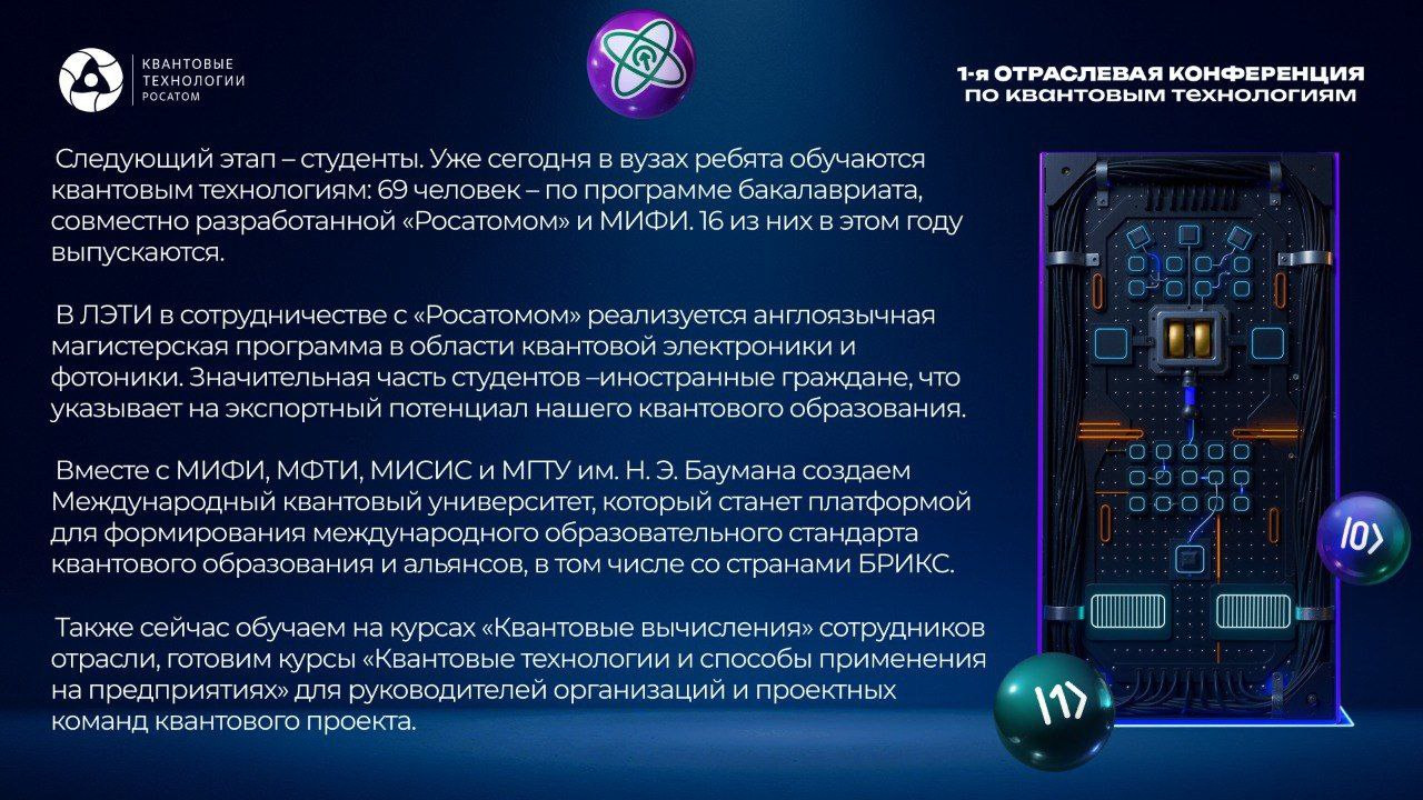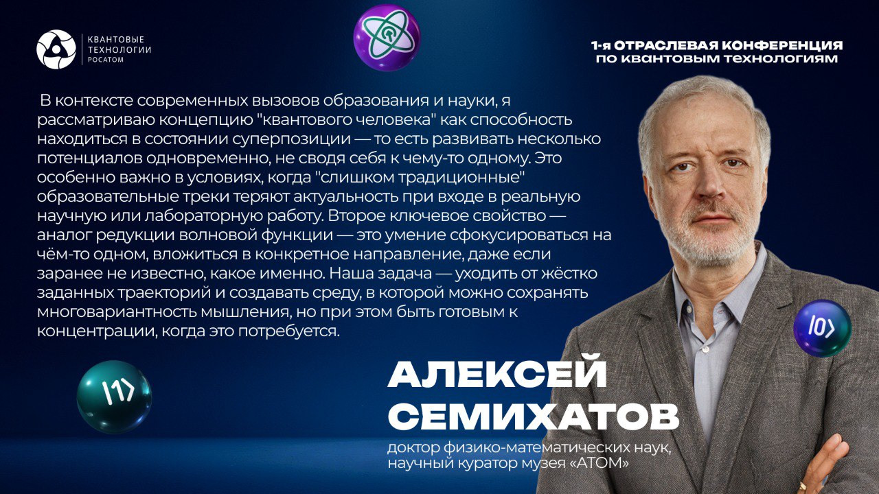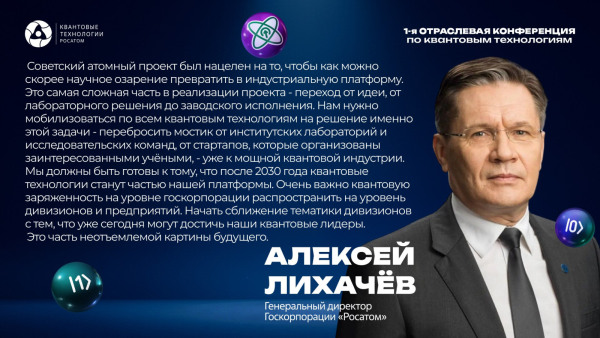 Глава «Росатома» Алексей Лихачев в ходе своего выступления призвал перейти к долгосрочным горизонтам планирования работы и сформулировать сверхзадачу развития квантового направления. Он апеллировал к опыту Атомного проекта: запуск в 1947 году программы мирного использования атомной энергии позволил российской атомной отрасли стать лидером в новом веке.