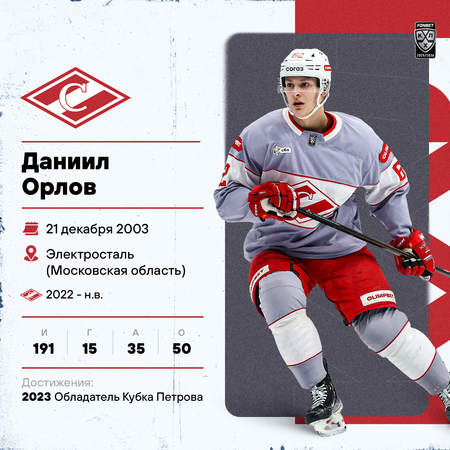 В эпоху Алексея Жамнова в «Спартаке» стремительно развивается защитник Даниил Орлов. Уроженец Электростали ещё с юных лет попал в орбиту красно-белых, быстро перемахнул ступени МХЛ и ВХЛ и вот уже третий сезон является одним из основных игроков обороны «Спартака». В 22 года Орлов проводит прорывной сезон в карьере, являясь вторым по результативности защитником-бомбардиров московского клуба, что послужило поводом для попадания Даниила на Фонбет Матч Звезд КХЛ в Екатеринбурге. За Орлова проголосовали журналисты, а сам хоккеист как бы в ответ на это всегда дружелюбно, открыто и откровенно общается с представителями прессы.