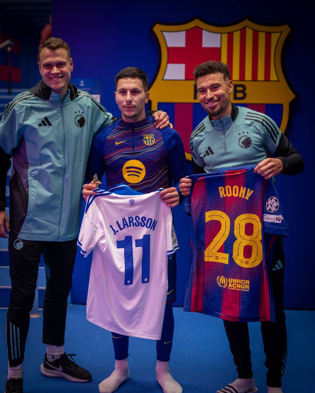 Пресс-служба «Барселоны» на своей странице в социальной сети X опубликовала фотографию с бывшим нападающим «Спартака» Джорданом Ларссоном и экс-полузащитником «Краснодара» Виктором Классоном после матча с «Копенгагеном» (4:1) в 8-м туре общего этапа Лиги чемпионов. Ларссон играет за команду из Дании с 2023 года, Классон — с 2022 года.