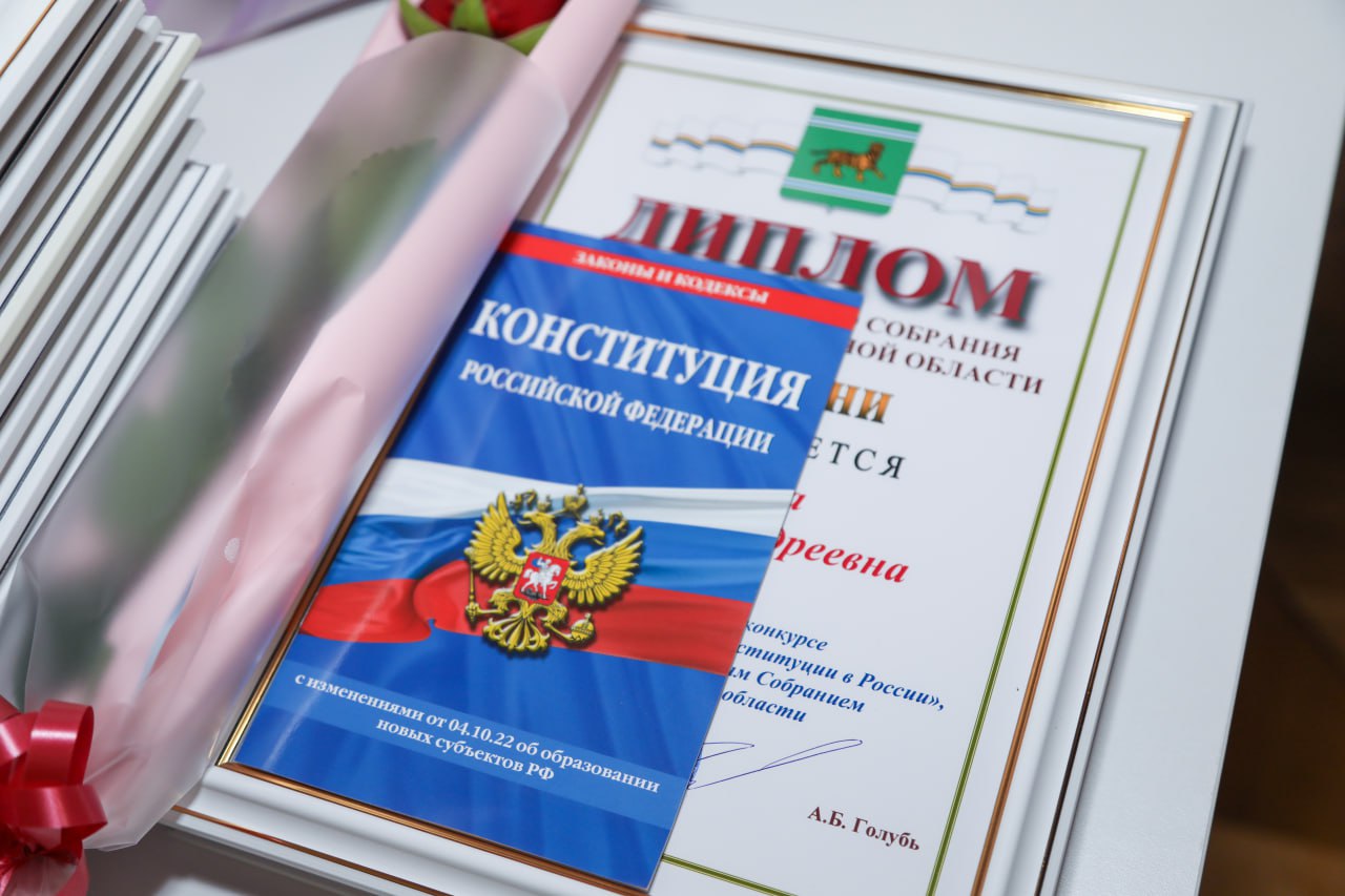 Победителем учрежденного Заксобранием пятого конкурса, посвященного Основному закону страны, признана ученица второй школы п. Николаевка Елена Уханова. Второе место заняла учащаяся 19-го лицея РЖД Елизавета Гришина. Третье – ученик пятой школы с. Пашково Олег Плетнев.