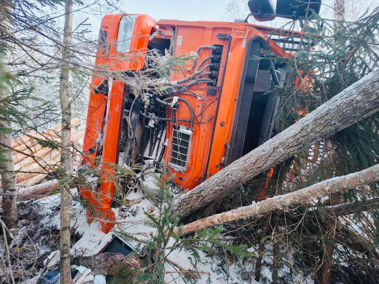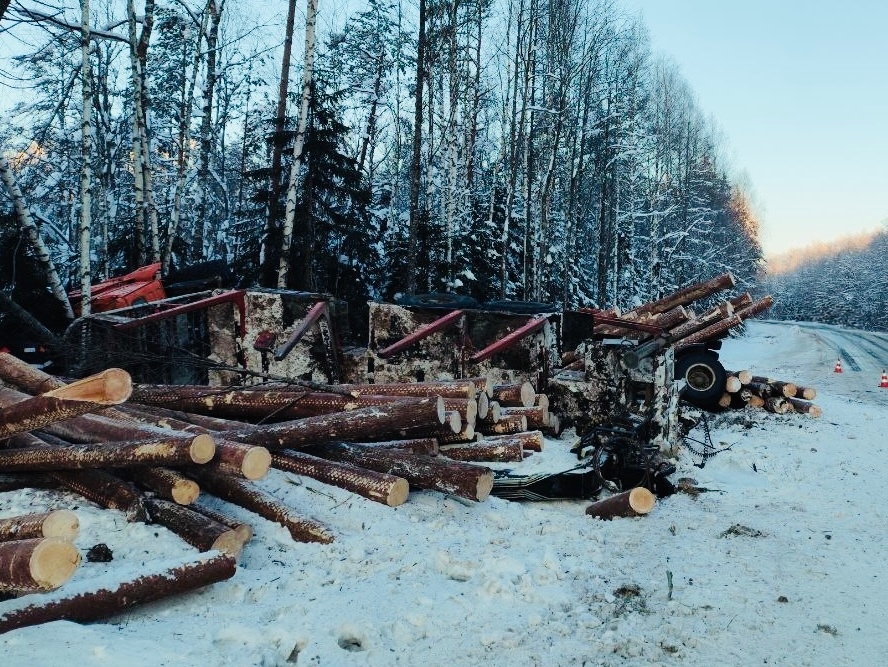 Как сообщает управление ГАИ по Вологодской области, по предварительным данным, в 15:27 водитель КамАЗа с прицепом, груженным бревнами, не справился с управлением. Машина вылетела с дороги в лес и опрокинулась. 42-летний водитель скончался на месте до приезда скорой помощи.