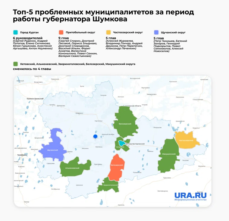 Всего за время губернаторства Шумкова в каждом округе сменилось в среднем по четыре главы, в некоторых муниципалитетах — по пять-девять глав. Только в Кургане при Шумкове было шесть руководителей (Сергей Руденко, Андрей Потапов, Елена Ситникова, Юлия Гурьянова, Анастасия Аргышева, Антон Науменко). Единственная территория, где не менялся начальник — Шатровский район, которым с 2009 года управляет Леонид Рассохин.