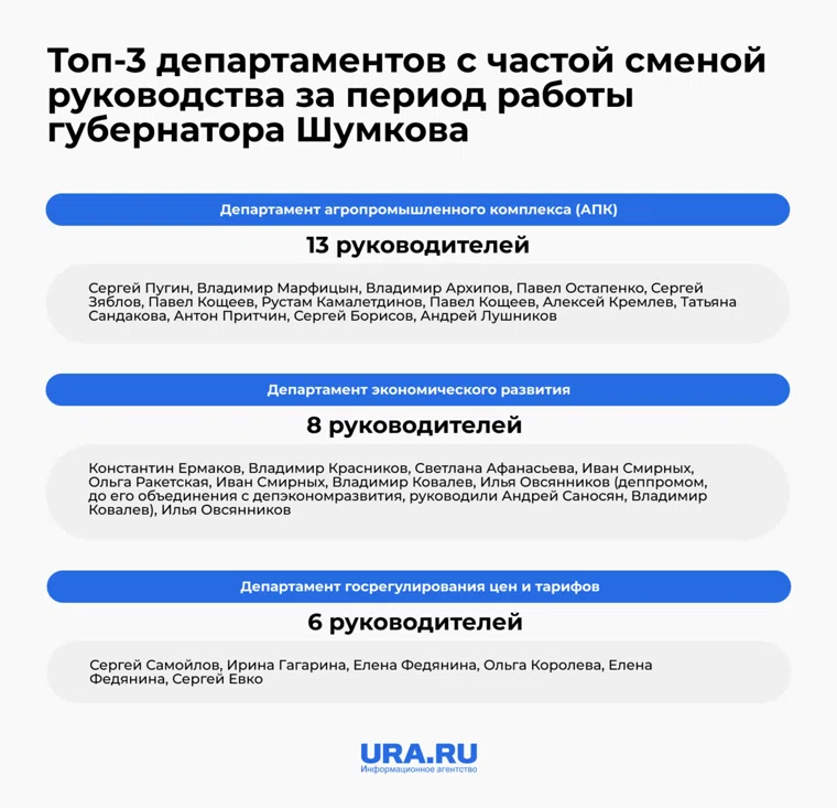 Рекорд по смене управленцев в период губернатора Шумкова показал департамент агропромышленного комплекса (АПК). Здесь сменилось 13 руководителей. Второе место по нестабильности у департамента экономического развития — сменилось восемь руководителей. На третье строчке антирейтинга — департамент госрегулирования цен и тарифов (шесть руководителей).