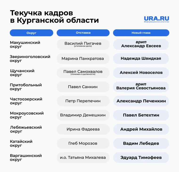 Нередки для Курганской области и массовые исходы чиновников из администраций — часто после правительственных проверок. Например, летом 2025 года после проверки в Щучанском округе уволились заместитель главы по социальным вопросам Наталья Ушакова и замглавы Андрей Бывакин, который позже переехал в Челябинскую область. А глава округа Павел Самохвалов был понижен в должности.