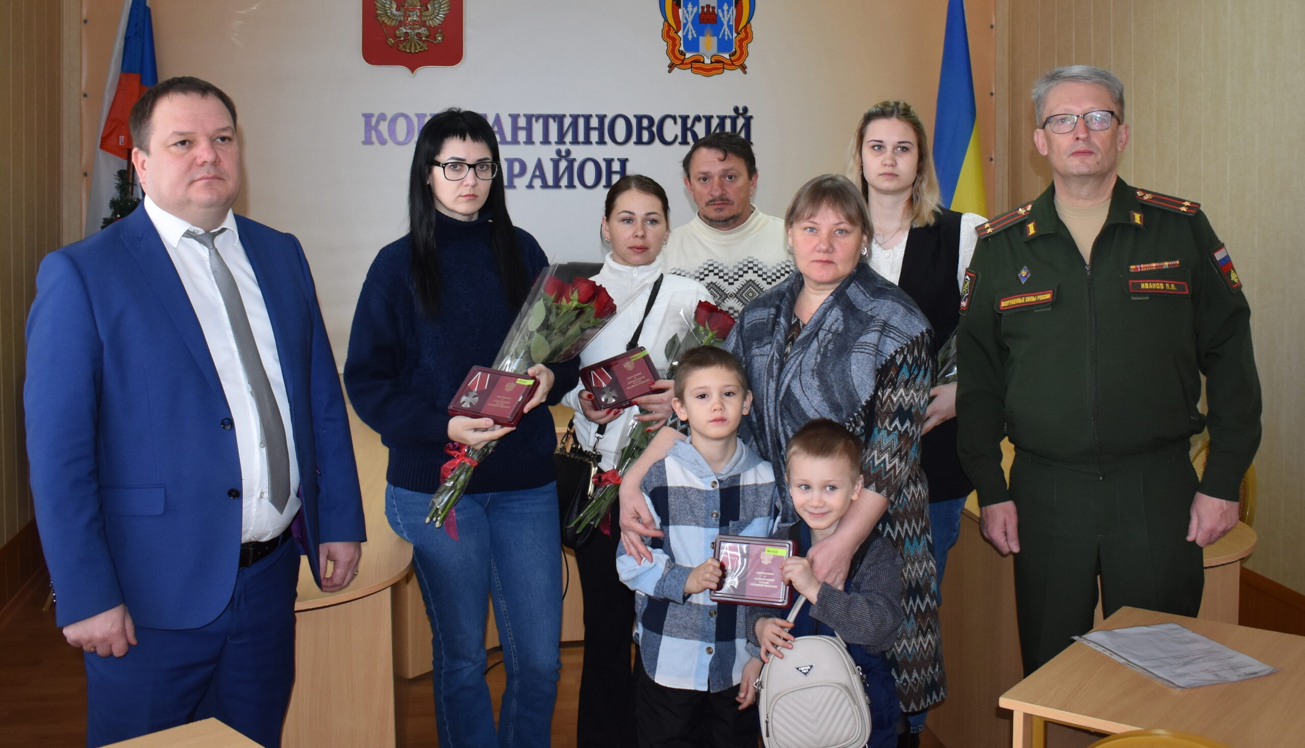 Глава администрации Константиновского района В.А.Дьячкин вместе с военным комиссаром по Константиновскому и Усть-Донецкому районам П.П.Ивановым торжественно передали ордена Мужества родным Сергея Ивановича Кремлева, Николая Алексеевича Бордачева и Юрия Александровича Перцева, героически погибших в ходе специальной военной операции.