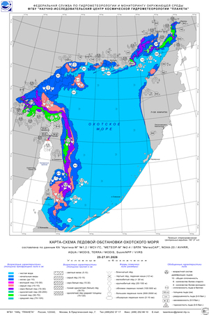 В середине III декады января 2026 года на погоду Охотского моря оказывал влияние активный циклон, центр которого сместился с полуострова Камчатка в район Шантарских островов. Отрицательные температуры воздуха выше нормы (-9°С…-4°С) с ветром северной и восточной четвертей, 5-10 м/с, с порывами до 22-27 м/с на севере моря и 16°С…-20°С – на юго-западе моря, способствовали вялому ледообразованию и перераспределению льда на севере моря и дальнейшему нарастанию льда на юге Охотского моря.