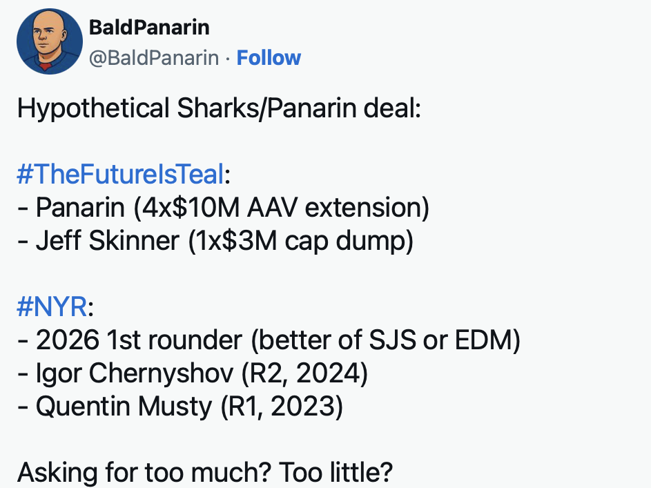 Предполагаемые требования «синерубашечников» соответствовали параметрам сделки по Броку Нелсону на дедлайне прошлого сезона и включали одного молодого игрока, а также первый и третий раунды драфта. Согласно рейтингу проспектов Daily Faceoff по итогам минувшего межсезонья, Квентин Масти и Игорь Чернышов занимают в системе «Шаркс» пятое и седьмое места соответственно.