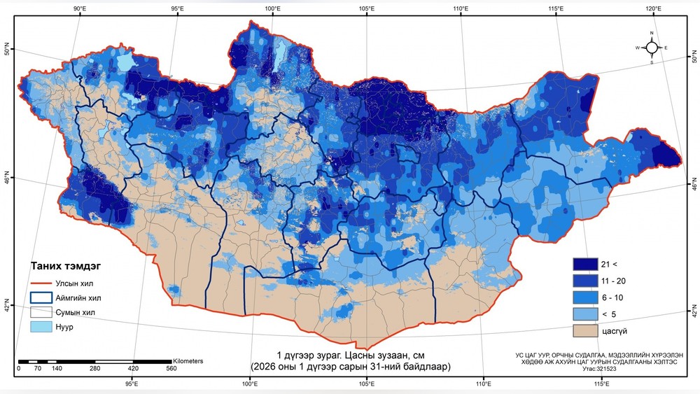 Наибольшая толщина снежного покрова, достигающая 31-47 см, зафиксирована в сомонах Ховд, Цагаанхайрхан, Хяргас (аймак Увс), Цэцэн-Уул, Баянтэс, Нөмрөг (аймак Завхан), Цэцэрлэг, Алаг-Эрдэнэ (аймак Хубсугул), а также в Ерөө, Орхонтуул, Орхон и других местах аймака Сэлэнгэ. Сравнительно с предыдущими десятью днями, уровень снежного покрова снизился на 14 процентов.