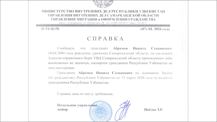 От МВД Узбекистана уже пришла справка о том, что у Никиты Абрамова нет (и не могло быть!) узбекского гражданства. Но миграционные органы такие детали, видимо, не смущают. Русский человек, получается, Родине неугоден? Вот такой свадебный "подарок" студенту.