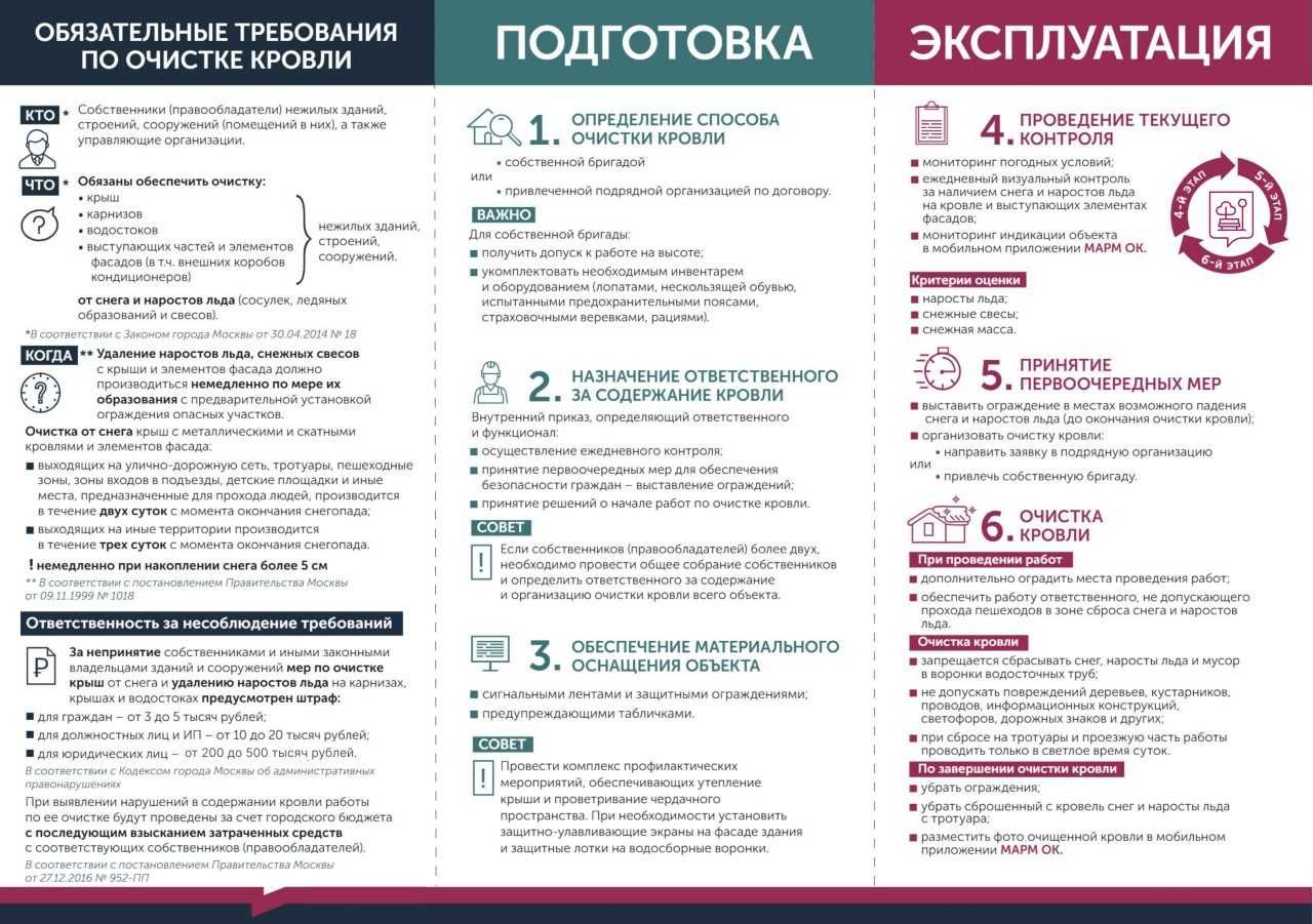 «Если здание находится в собственности более двух юридических лиц, необходимо провести общее собрание собственников и определить ответственного за содержание и организацию очистки кровли всего объекта. Размер штрафа за непринятие мер по очистке крыш от снега и льда для юридических лиц составляет от 200 тысяч до 500 тысяч рублей. Нормы закреплены в статье 8.12 Кодекса города Москвы об административных правонарушениях. Чтобы избежать штрафов или других более тяжелых последствий, призываем всех собственников своевременно очищать кровли», — отметил начальник Объединения административно-технических инспекций города Москвы (ОАТИ) Александр Ларин.