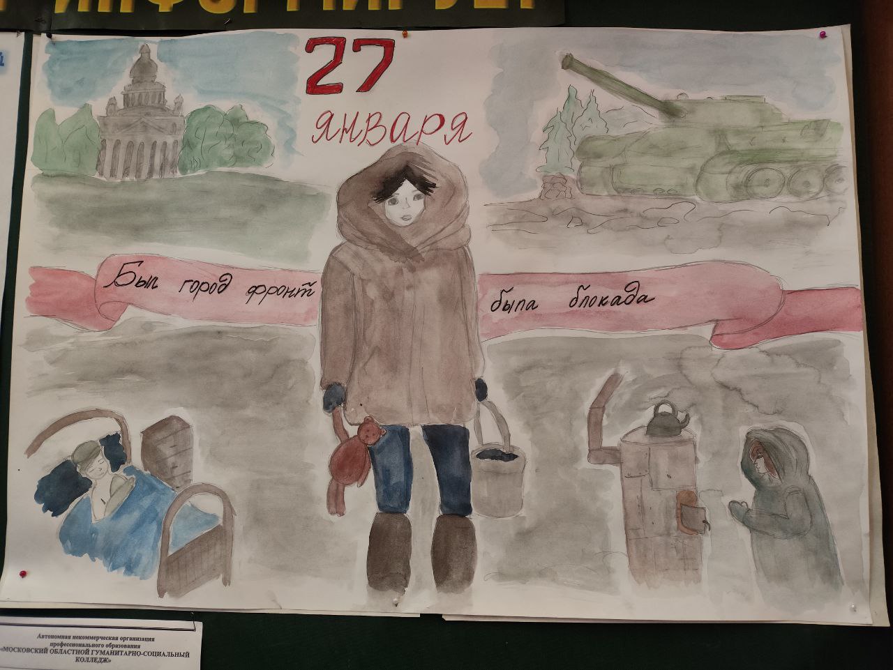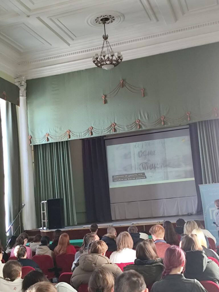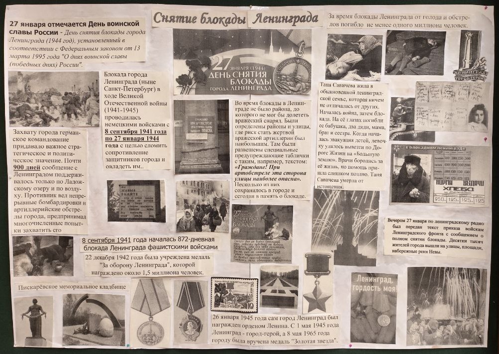 В актовом зале состоялось большое мероприятие, посвященное блокаде Ленинграда. Ведущие композиции рассказали зрителям о блокаде, представили несколько документальных фильмов о Дороге Жизни, Ленинградской симфонии, о Г.Вишневской, о блокадном хлебе, о дневнике Тани Савичевой. Также зрители посмотрели художественный фильм «Крик тишины», после просмотра поделились своими эмоциями. Ребята благодарили организаторов за душевное, трогательное, важное для молодёжи мероприятие.