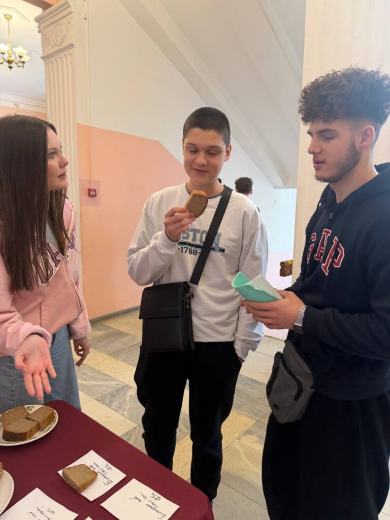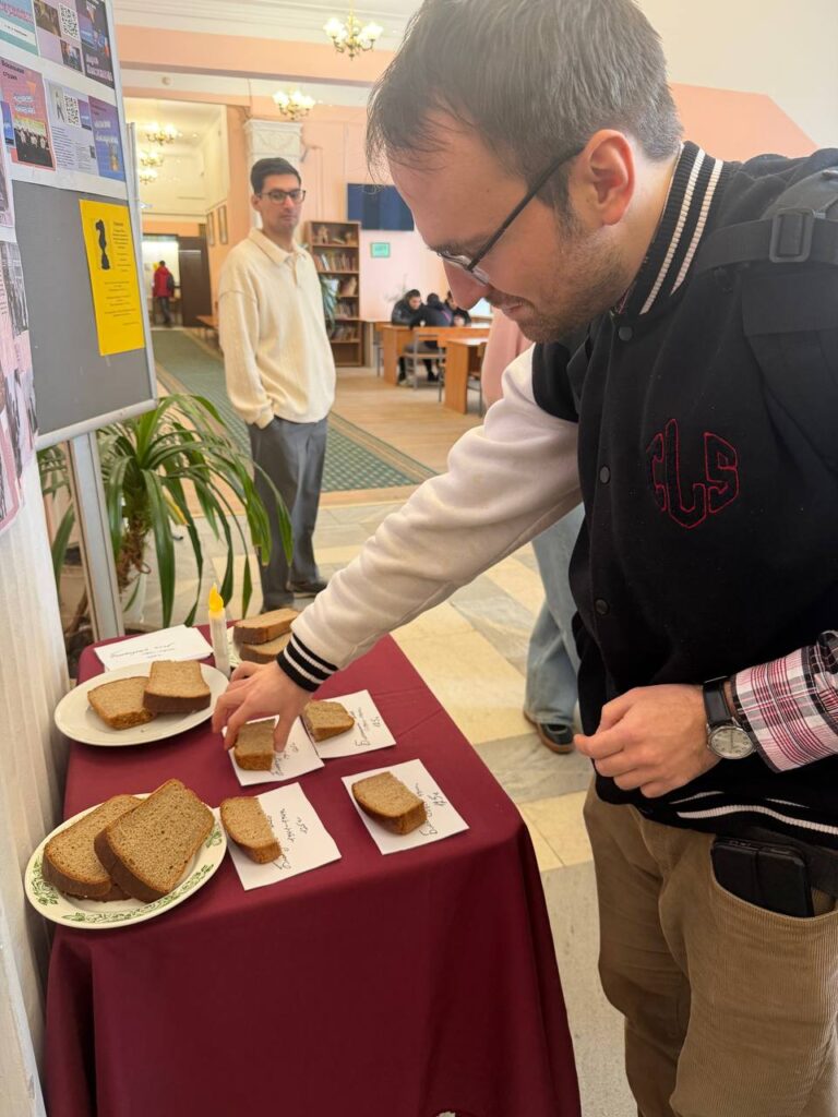 Ребята не только рассказали о кусочке хлеба, который спасал жизни ленинградцев, подготовили плакат о этом, но и наглядно показали, какого размера был этот кусочек, раздавая такой хлеб студентам.