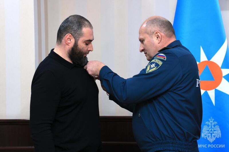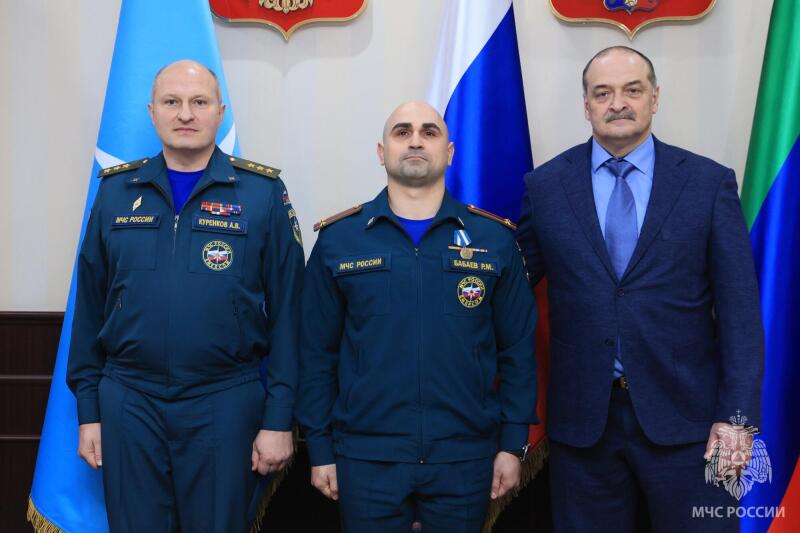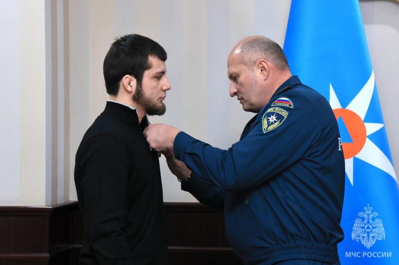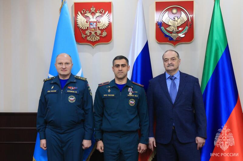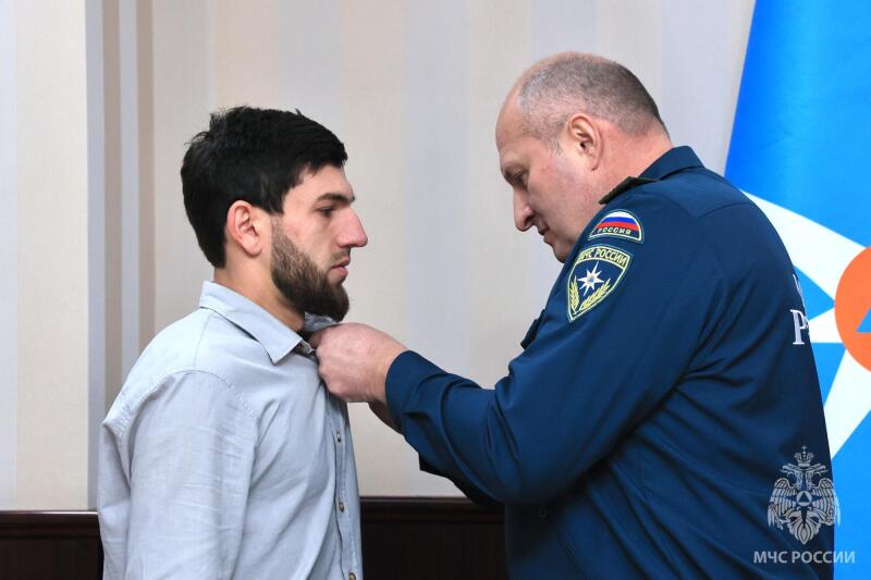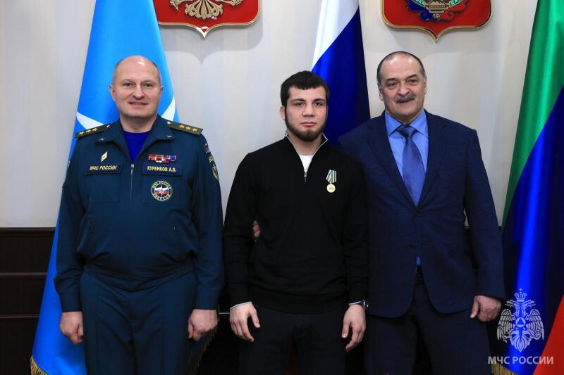Глава МЧС России вручил ведомственные медали за мужество и безупречную службу. Среди награжденных жители Махачкалы, спасшие водителя и пассажиров из автомобиля, упавшего в канал Октябрьской революции. Случай произошел ночью 25 января этого года: легковушку занесло на обледеневшей дороге - она упала в воду. Очевидцы Ахмед Магомедов, Алимирзе Наврузбеков и Абдулсамад Омаров, проезжавшие мимо на разных авто, бросились на помощь и спасли водителя и бабушку с внуком. За проявленные смелость и самоотверженность все отважные награждены медалями МЧС России «За спасение погибающих на водах». Награду вручили и Закиру Исрапилову. В июне прошлого года он стал очевидцем пожара в частном доме в селе Нижний Дженгутай: Закир дважды заходил в горящее жилье, чтобы вынести из дома до прибытия пожарных мать с четырьмя детьми.