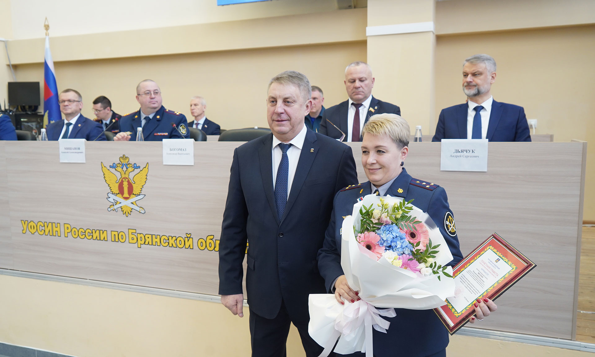 Начальник УФСИН России по Брянской области Алексей Мишанов выразил благодарность руководителям контрольно-надзорных, исполнительных, правоохранительных органов Брянской области, общественных организаций за понимание и содействие при решении задач, стоящих перед уголовно-исполнительной системой. Он поблагодарил ветеранов за активную жизненную позицию в решении проблемных вопросов деятельности Управления и подразделений.