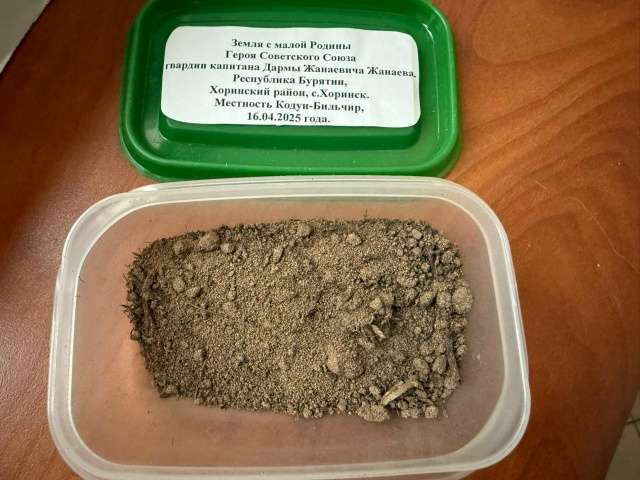 Посылку с контейнером, в который хоринцы положили горсть земли, взятой в местности Бильчир, где много лет назад родился будущий Герой Советского Союза, отправили в польский город Жагань 27 апреля 2025 года, в день установки в с. Хоринск бронзового бюста Дармы Жанаевича Жанаева. Тело нашего знаменитого земляка, погибшего в боях за Берлин в апреле 1945 года, покоится на Жаганьковском кладбище № 3, под могильной плитой № 16.