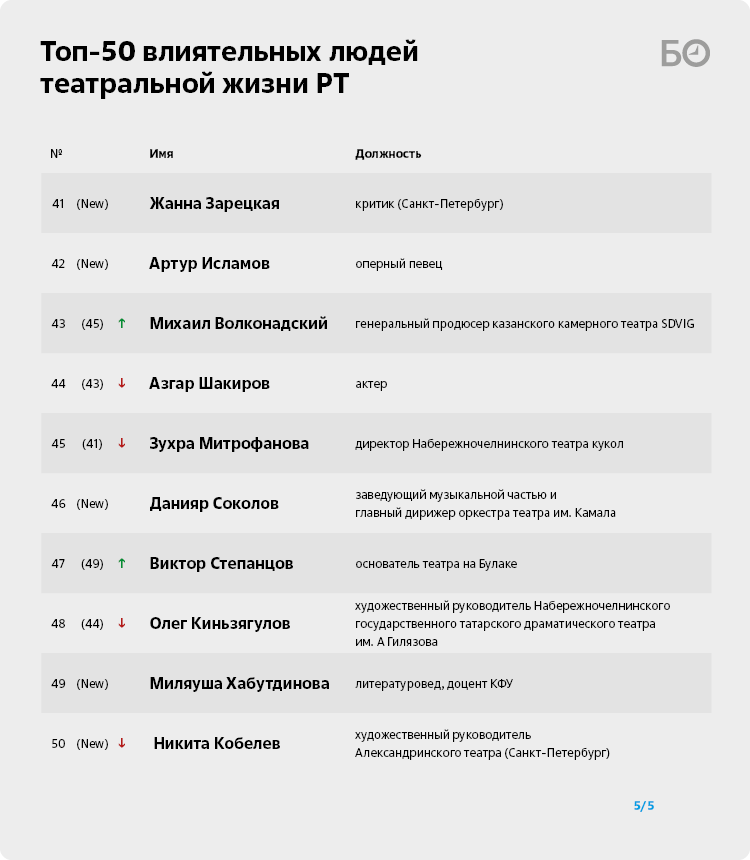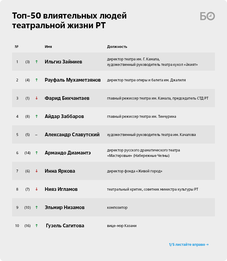 Новое лицо нашего рейтинга — Резеда Губаева (17), которую называют яркой представительницей современной татарской драматургии. Супруга лидера нашего рейтинга Зайниева при этом часто и плодотворно работает с режиссером Заббаровым: именно по ее инсценировке был поставлен мюзикл «Вслед за мечтой», а также кассовые «Альфия Авзалова. Путь в вечность» и «Возвращение Тукая» в театре им. Камала. Несмотря на то что Губаева стала заведующей литературной частью Тинчуринского, она продолжает сотрудничать с другими театрами, пишет сценарии к республиканским мероприятиям.