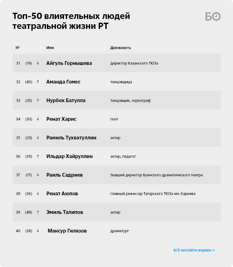 В нашем рейтинге не сдает позиции живая легенда татарского театра Азгар Шакиров (44), который отметил в прошлом году 85-летие. Он настоящий символ старой татарской актерской школы. И Ильдар Хайруллин (36) остается главным татарским театральным педагогом. Большинство татарских артистов, прошедших через Казанское театральное училище, являются его воспитанниками.