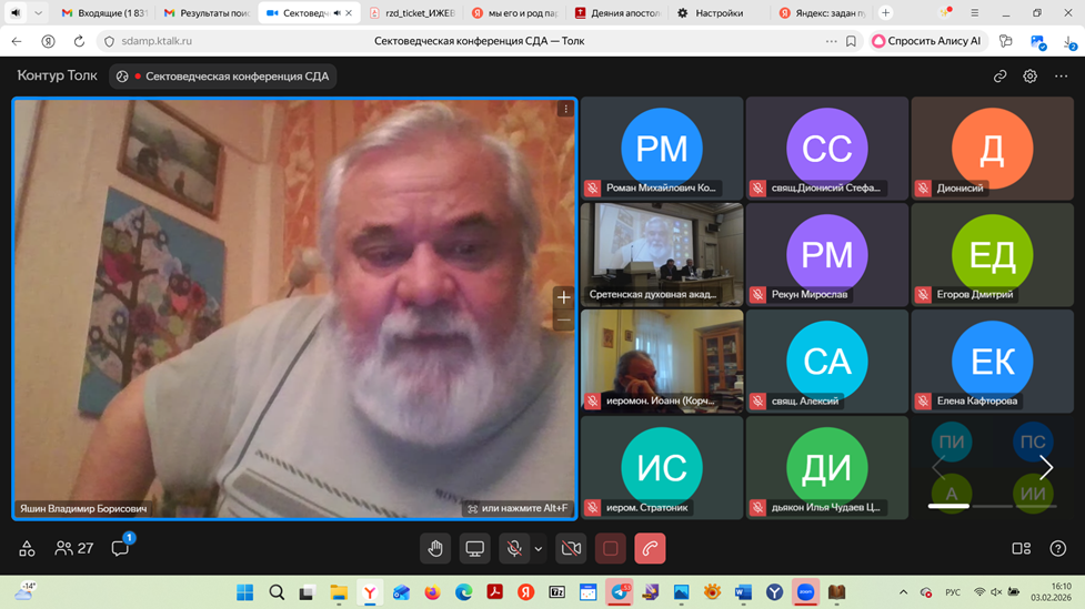 Второе отделение конференции началось с доклада Владимира Борисовича Яшина, кандидата исторических наук, доцента кафедры всеобщей истории, социологии и политологии Омского государственного педагогического университета, доцента кафедры библейских, богословских, и церковно-исторических дисциплин Омской духовной семинарии «Неоязыческий синкретизм в религиозном пространстве России в первой четверти XXI в. (на примере движения "Ата Жолы"/ "Путь предков")».