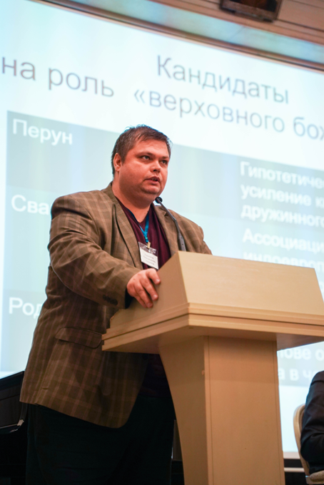 Лушников Александр Александрович, кандидат исторических наук, доцент кафедры «Менеджмент, информатика и общегуманитарные науки» Финансового университета при Правительстве РФ (Пензенский филиал)свой доклад«Верховный бог восточнославянского язычества — важная часть современной мифологии неоязыческой и научной среды» посвятил «вторичной мифологии» — современному мифу о бытовании у восточных славян культа верховного божества, распространенномукак в неоязыческой, так и религиоведческой среде. Кандидатами на роль такого бога могут быть Перун, Сварог и чаще всего Род. Автор рассматривает источники формирования книжной мифологемы Рода и рожаниц через схемы «Панариона» свт. Епифания Кипрского и «Хроники» Георгия Амартола, оказавшие влияния на формирование исторических представлений древнерусских книжников. Наряду с этим докладчик поднимает проблему бытования современной мифологии рода в эзотерическом учении «родология», оказывающем значительное влияние на психологов и педагогов и ставшим популярным коммерческим проектом.