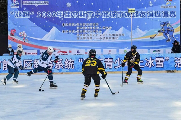 В катковом зале центра массовой физкультуры и здоровья уезда Хуанань города Цзямусы провинции Хэйлунцзян открылся турнир «Бин Чао» («Ледяная суперлига») 2026 года — дружеские соревнования по хоккею с шайбой между городами России и Китая.