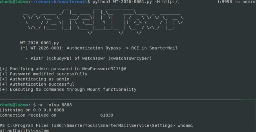 Суть уязвимости заключается в том, что API-эндпоинт /api/v1/settings/sysadmin/connect-to-hub не требует авторизации и обрабатывает JSON из POST-запросов. Атакующие отправляют запрос с параметром hubAddress, указывающим на контролируемый ими сервер. SmarterMail подключается к этому серверу и запрашивает данные конфигурации. Вредоносный сервер отвечает JSON-объектом, содержащим параметр CommandMount с произвольной командой ОС, которая затем выполняется на уязвимом сервере SmarterMail.