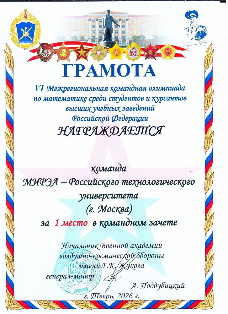 С 30 января по 1 февраля в Твери на базе Военной академии воздушно-космической обороны имени Маршала Советского Союза Г. К. Жукова проходила VI Межрегиональная командная олимпиада по математике среди студентов и курсантов высших учебных заведений Российской Федерации.