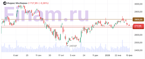 Российский рынок акций во вторник, 10 февраля, в ходе вечерней сессии демонстрирует незначительное снижение на фоне противоречивых геополитических сигналов. Давление на котировки оказывает обсуждение в ЕС возможного 20-го пакета санкций против РФ, в рамках которого ограничения могут быть введены против «Лукойла», «Газпрома» и «Росатома». Сдерживающим фактором для более глубокой коррекции выступают заявления Эмманюэля Макрона, который сообщил о предложении ряда европейских коллег возобновить диалог с Россией. Дополнительное внимание инвесторов привлекли заявления Сергея Лаврова. Он отметил, что практические шаги США на российском направлении за последний год не способствовали сближению позиций. По его словам, контакты Вашингтона со странами – покупателями российских нефти и газа отражают стремление США продвигать собственные интересы на глобальном энергетическом рынке.