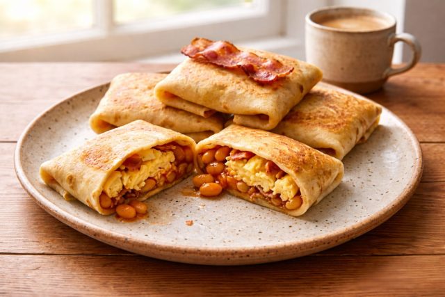 Очень плотная и тяжелая начинка для долгого насыщения: солоноватый жареный бекон хрустит, а мягкая фасоль в томате добавляет сочности. Яйца здесь работают как связующее звено, делая вкус обволакивающим, цельным и по-настоящему утренним.